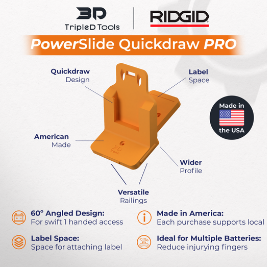 TripleD Tools PowerSlide Quickdraw Edge for Ridgid Power Tools Sleek Angled 3D Printed Battery Mount Fast Access Durable Design Made in USA